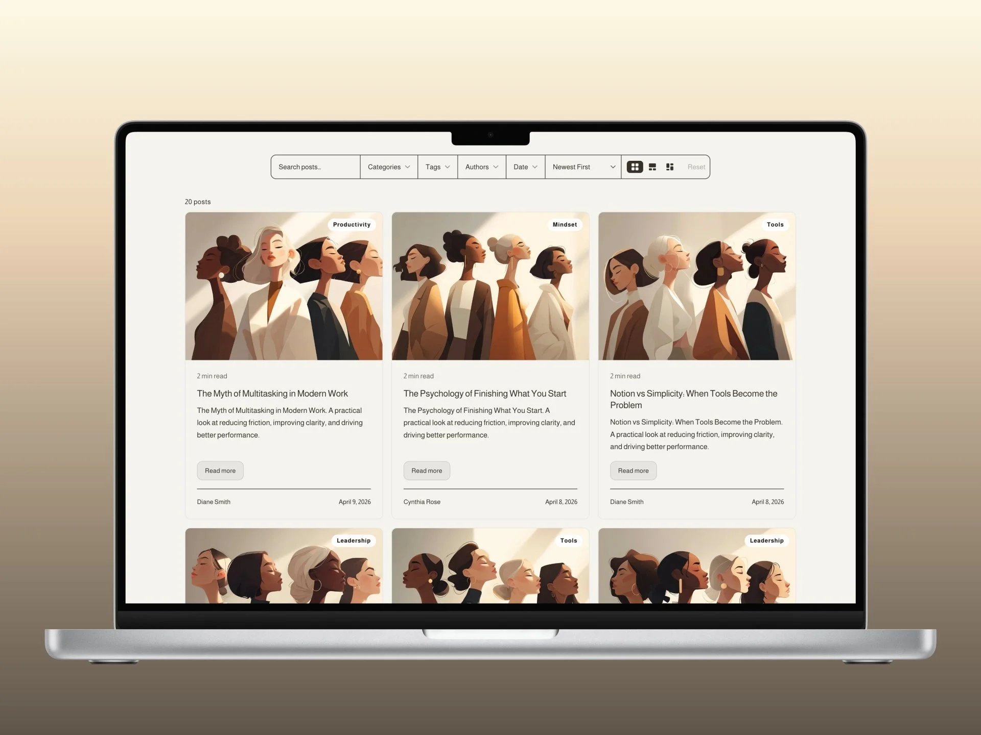The Blog Filter replaces the native listing with three fully configurable layouts: Grid, Newsroom, and Mosaic. Add instant search, filtering by category, tag, author, and year, and a load mode that suits the content. Everything reads your site's button styles automatically, so it fits any template without touching CSS.