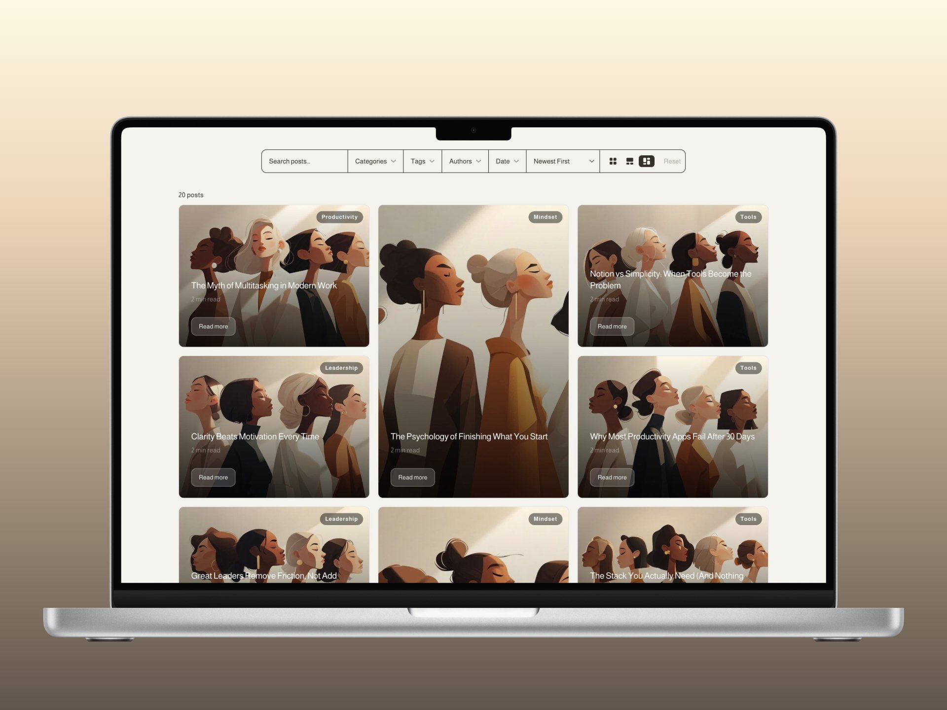 Most Squarespace blogs are a single scrolling list with no way to filter, search, or sort. For clients with growing archives — courses, articles, case studies, news — that's a problem. Visitors give up. Content gets buried.
