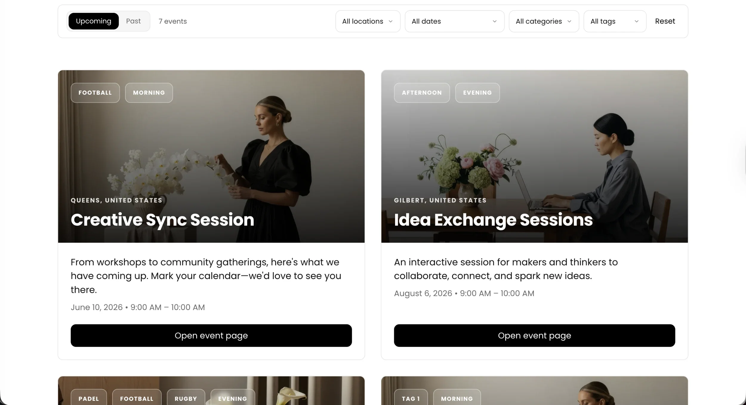 Visitors filter by date, location, category, and tag. They toggle between upcoming and past events. They find what they're looking for in seconds, not scroll after scroll.